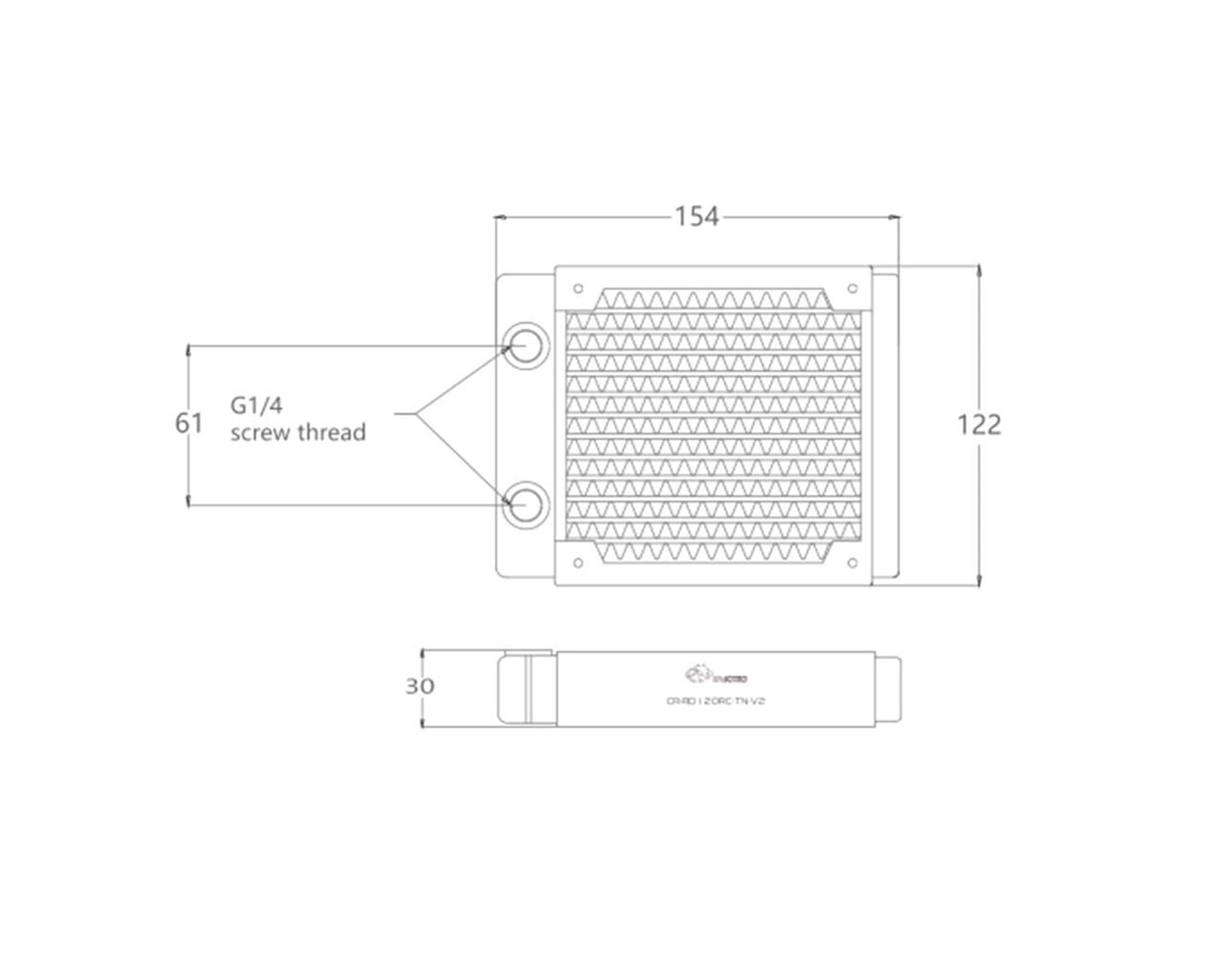 Bykski CR-RD120RC-TN-V2 radiator is designed as a single row of copper channels. The thickness of the radiator is 30mm which allows this radiator to be mounted in smaller profile locations. The water channels and wave fins are made of red copper with a thermal conductivity up to 401 w/(M.K.). There are 14 water channels aligned in a single row.