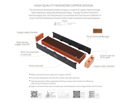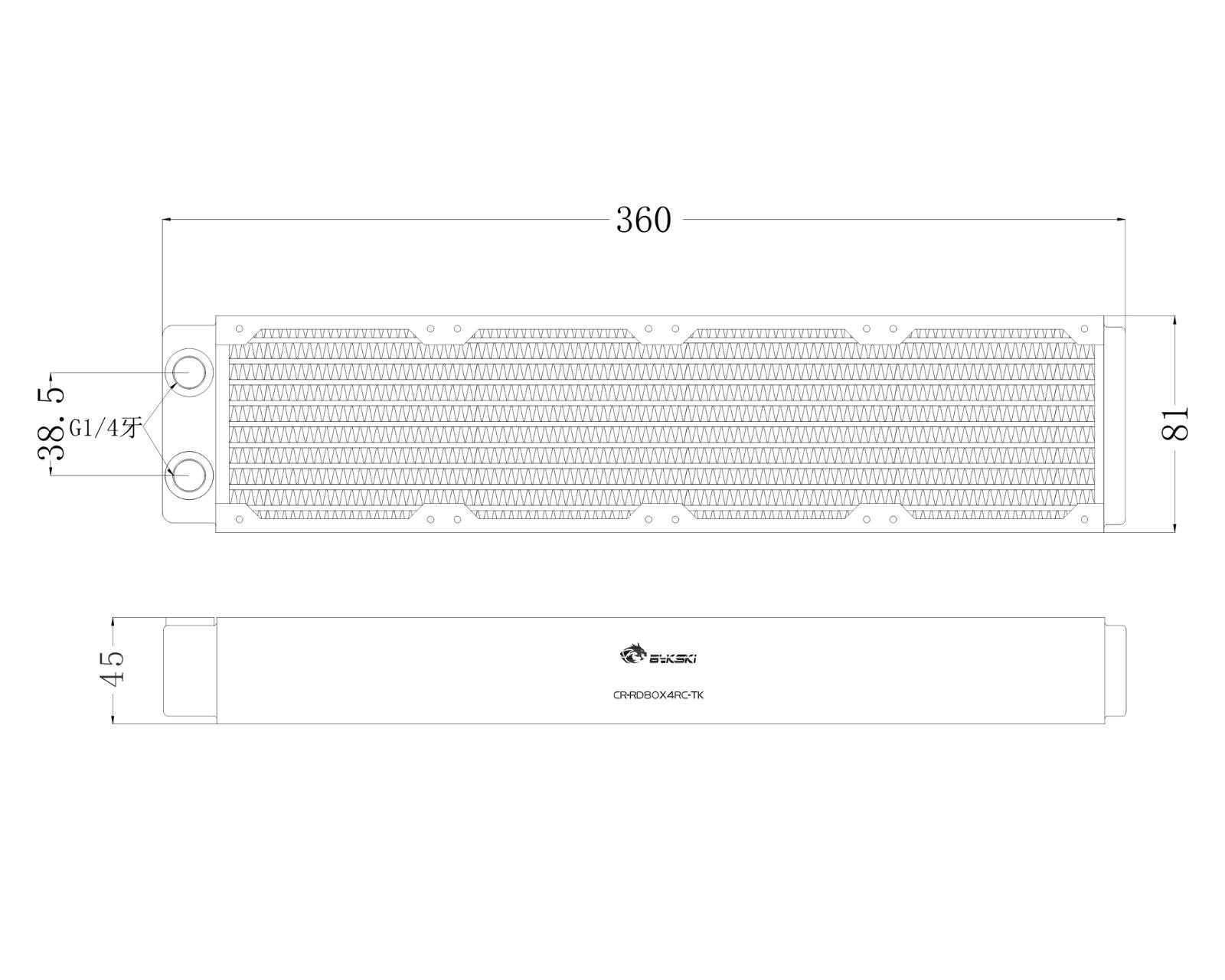 Bykski CR-RD80X4RC-TK radiator is designed as a single row of copper channels. The thickness of the radiator is 45mm which gives this radiator more cooling surface area. The water channels and wave fins are made of red copper with a thermal conductivity up to 401 w/(M.K.). There are 9 water channels aligned in a single row.