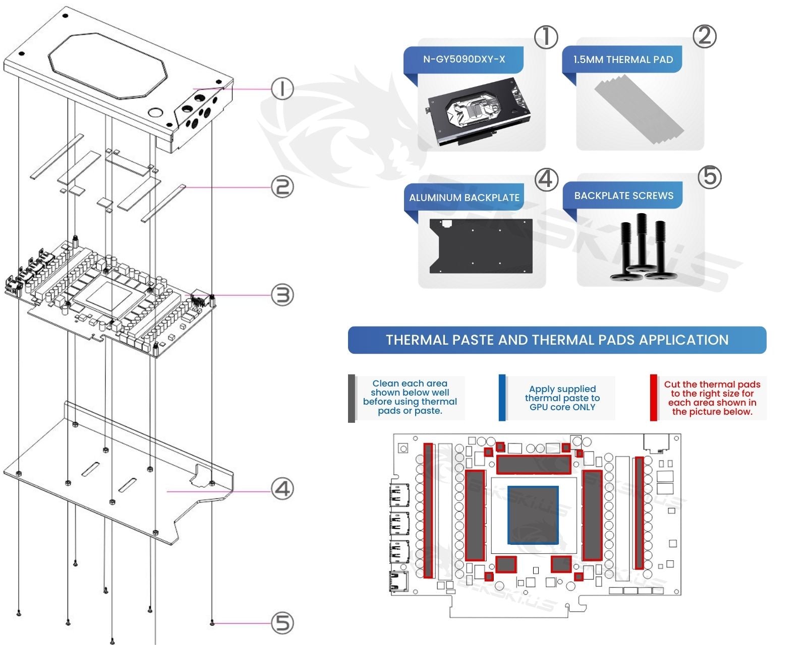 ThisN-GY5090DXY-X full-coverage block directly cools the video card core (GPU), graphics memory (RAM), and voltage regulator modules (VRM). By directly cooling these components, you can achieve great temperatures and reach higher overclocks while extending the overall lifespan of your card by running at lower temperatures.