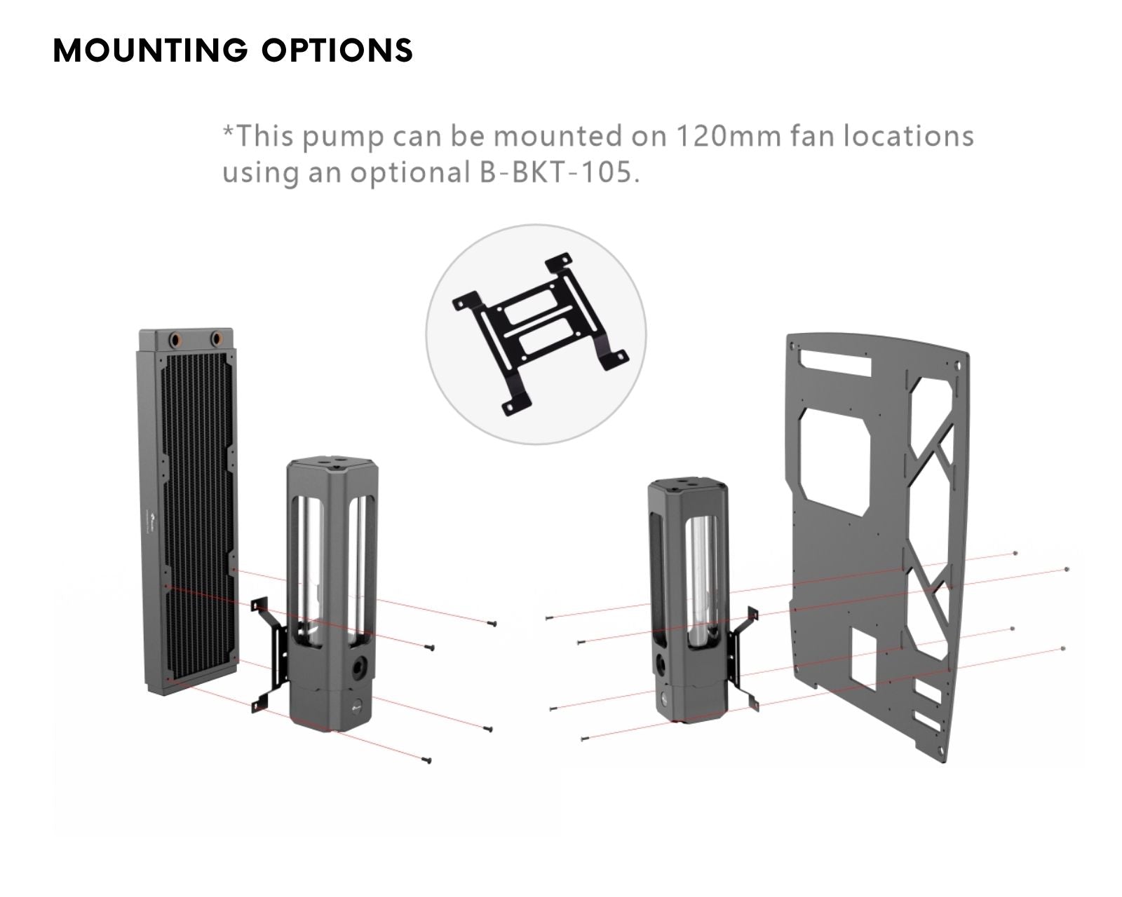 The CT-D5-180-X-V2 is a pump reservoir combo designed for use in liquid cooling loops. The square armor design gives a distinctive look compared to most pump reservoir combos. The unit features a capacity of 350 milliliters and two intake ports—one port for the loop return, one for filling—along with a single port for outputting coolant. It is mountable on any 120mm fan location using an optional bracket (B-BKT-105).