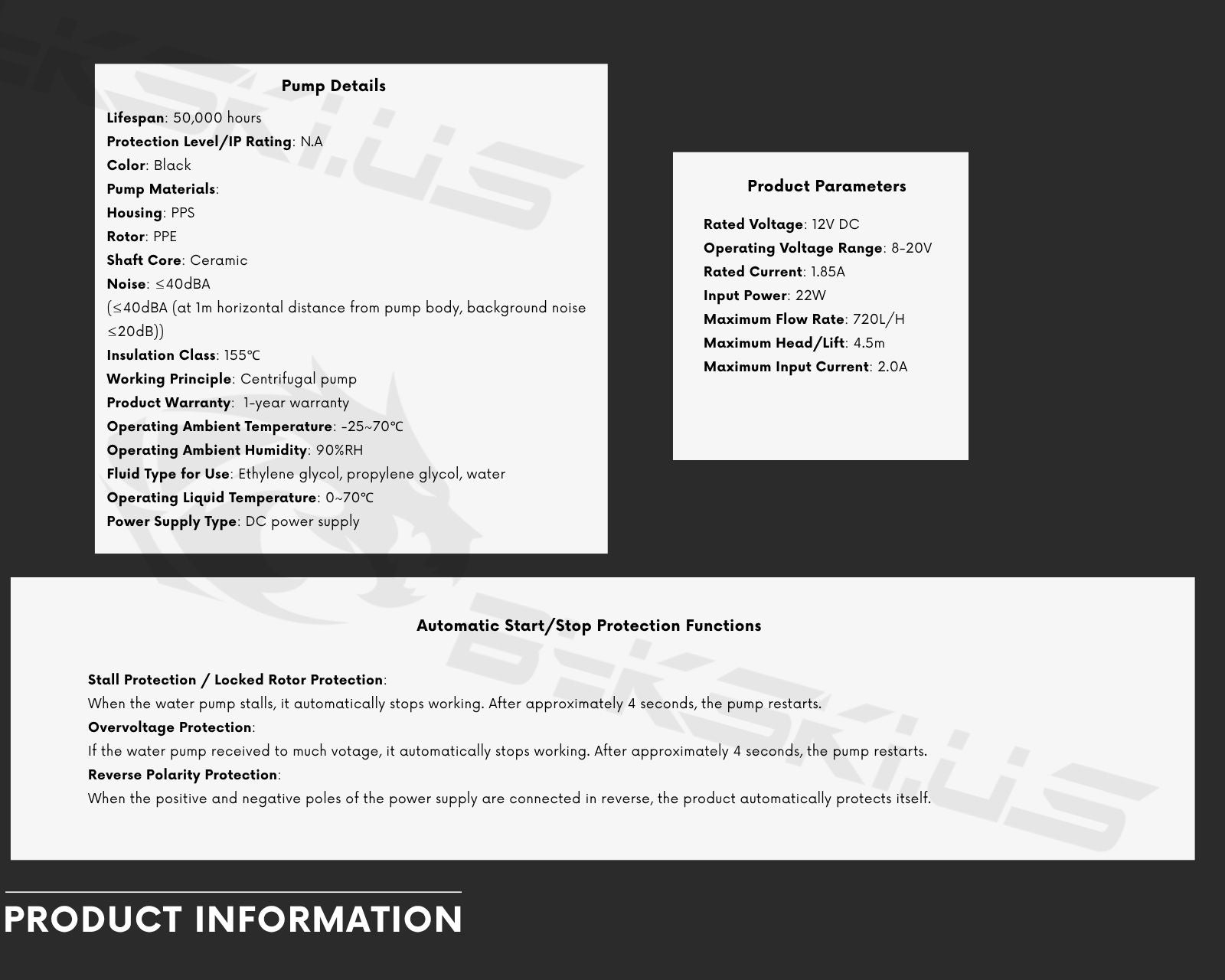 - Power Input: DC12v, 1.8A, Range 8-20V, RPM 4400