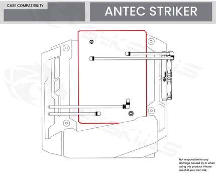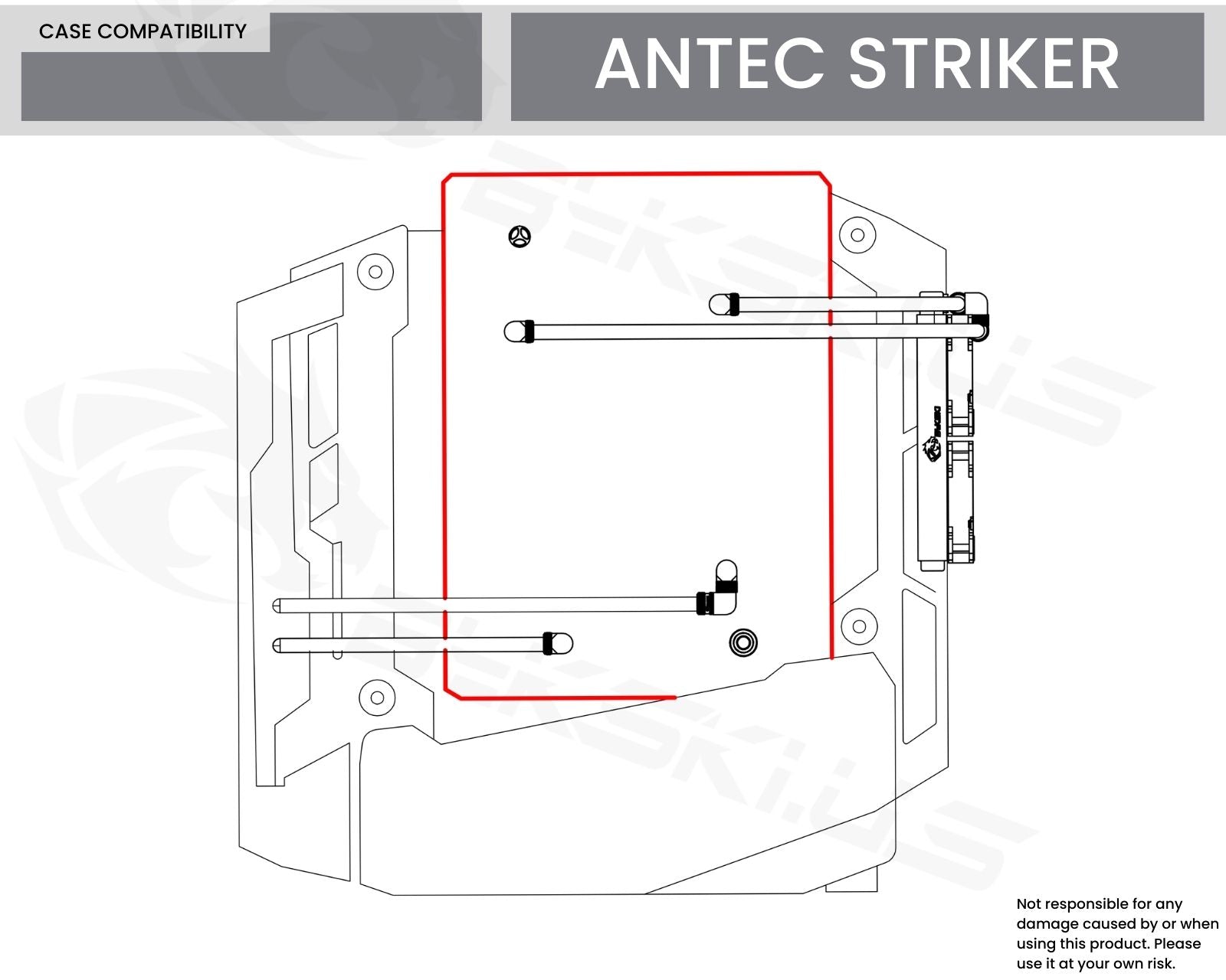 The Distro Plate is built using PMMA material, featuring G 1/4 threads, and is designed to be compatible with ANTEC-STRIKER case. It works well with Aluminum and Non-Aluminum loops and is engineered to support radiators up to 30mm thick or less.