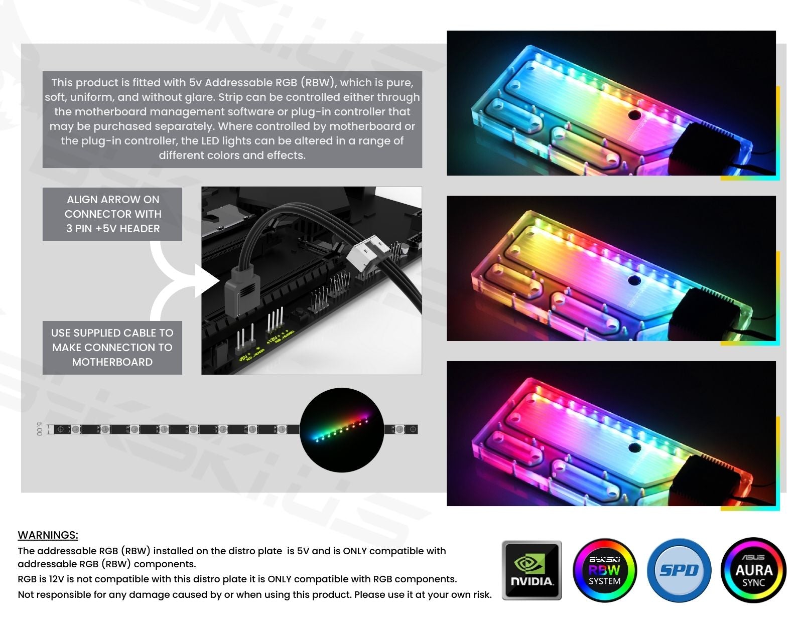 In addition to the Distro Plate itself, the package includes mounting hardware, an A-RGB (RBW) LED strip, and the option of including a DDC pump with armor, a DDC pump with LCD, or no pump at all. Bykski Distro Plates are an excellent option for those looking for a clean, visually appealing water-cooling solution that provides high-quality performance.