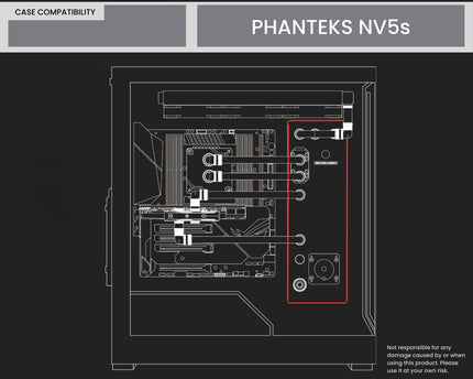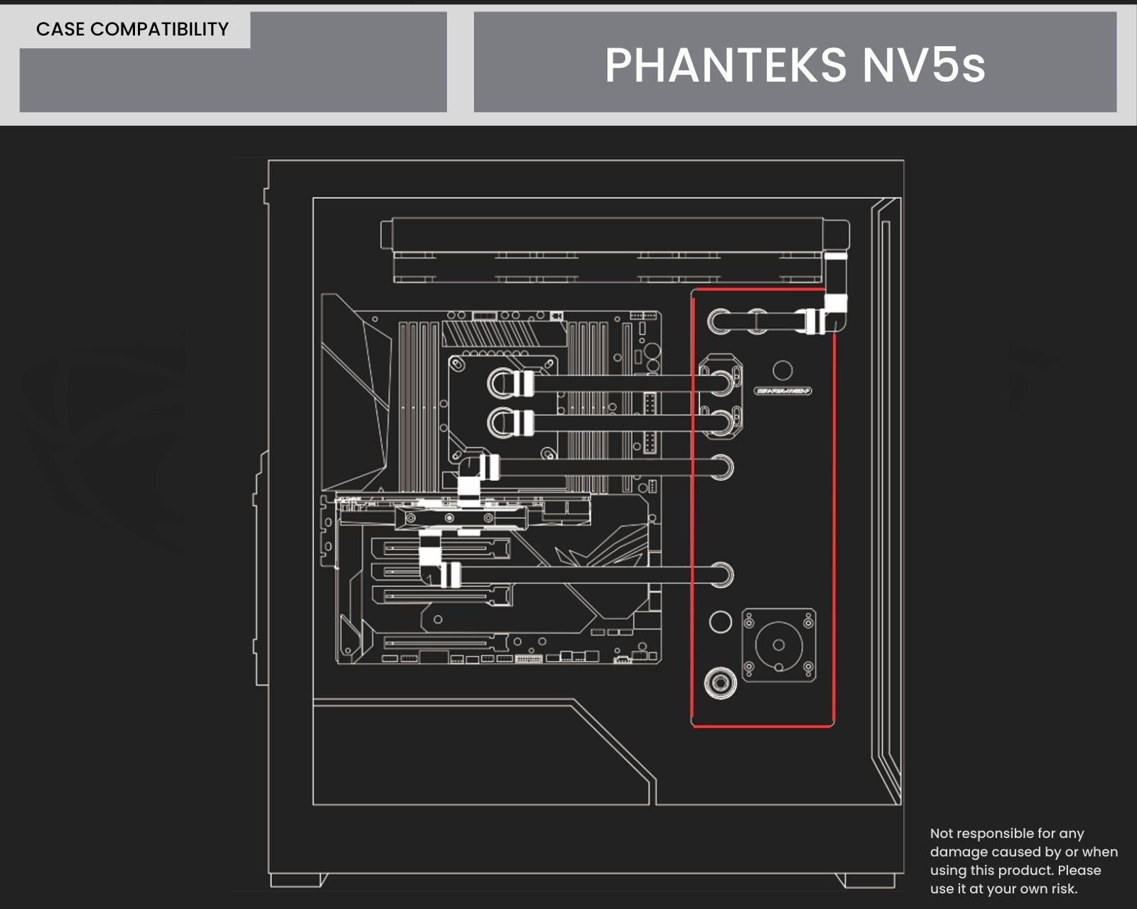 This distro is designed specifically for this case. Depending on the motherboard, blocks, fittings used, and layout, the connecting tubing may not appear as pictured (perfectly horizontal). Not responsible for any hardware damage. Use at your own risk.