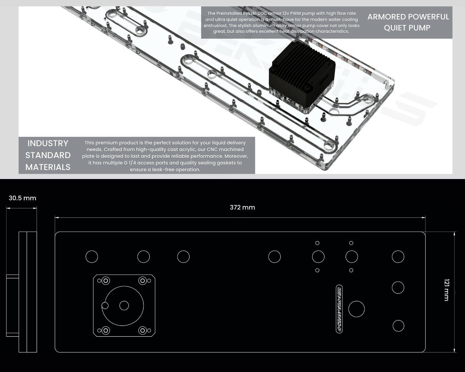 The Bykski Distro or Distribution Plates provide a distinct and innovative way to enhance your loop's appearance. These plates are customized to fit your specific case, creating a sleek and parallel look. Moreover, they can come equipped with an OPTIONAL inline pump, allowing you to power your entire loop from the centerpiece.