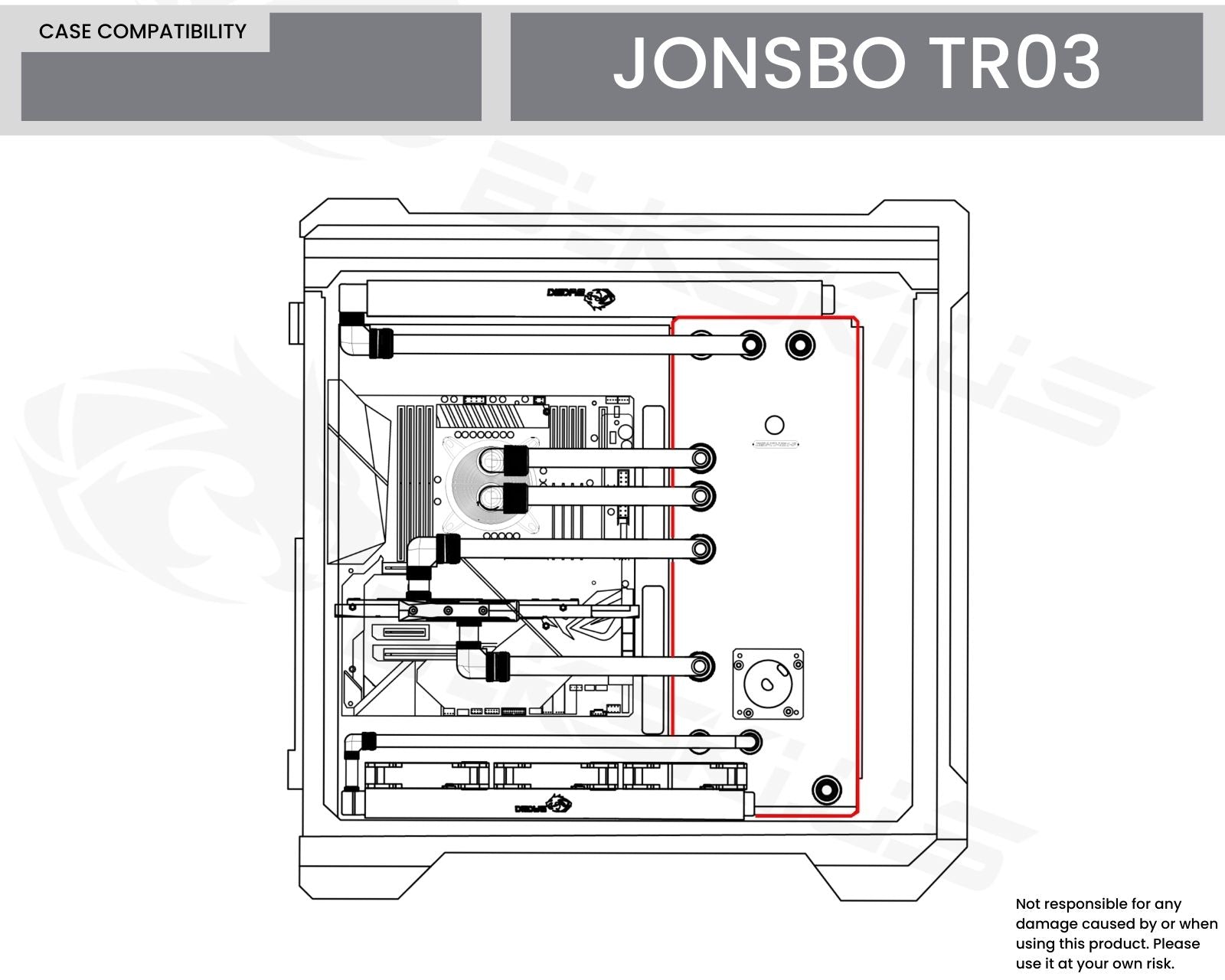 This is designed specifically for this case. Depending on the motherboard, blocks, fittings used, and layout, the connecting tubing may not appear as pictured (perfectly horizontal). Not responsible for any hardware damage. Use at your own risk.