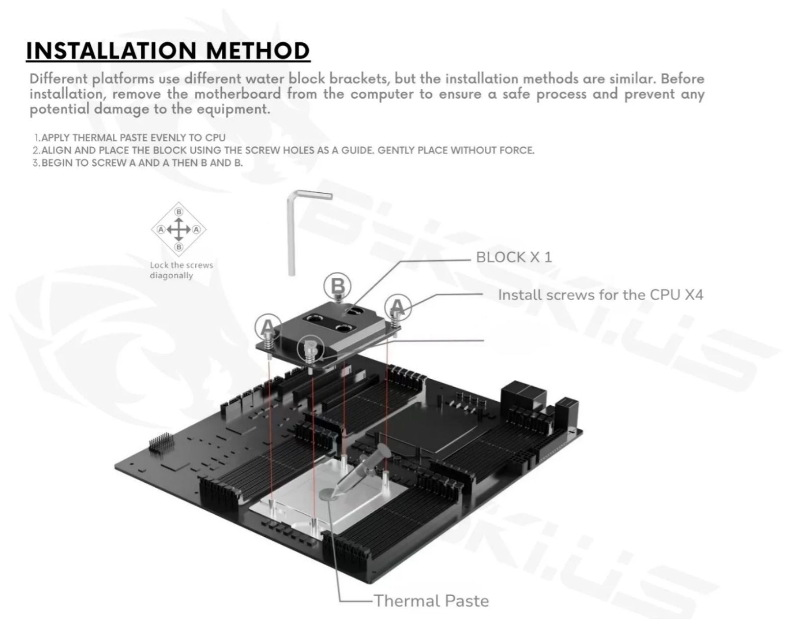 Apply thermal paste only to the CPU IHS. Ensure correct bracket orientation and even mounting pressure. Do not modify tubing or attempt to open the sealed loop; doing so will void warranty and can lead to leaks or failure.
