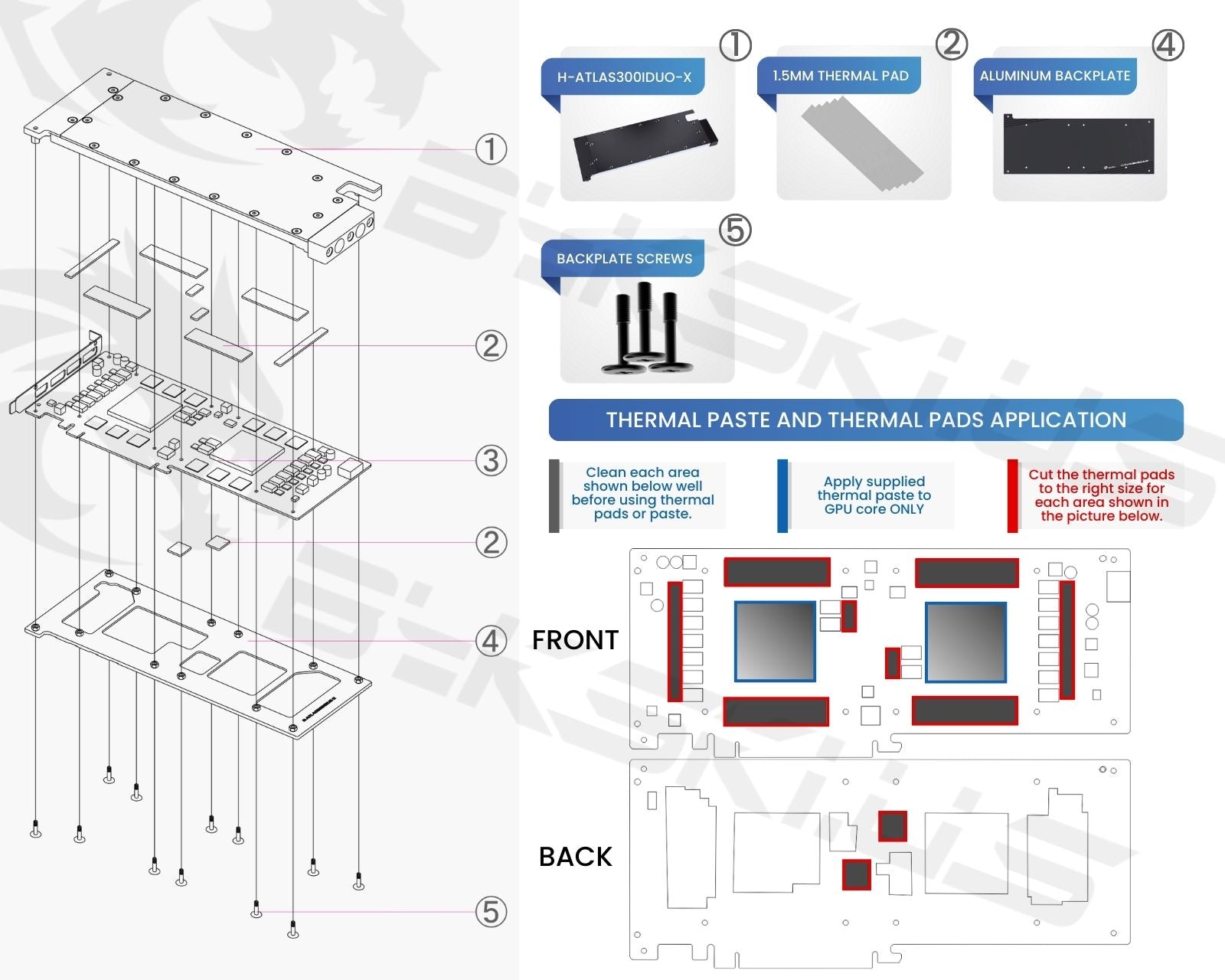 The manufacturer reserves the right to alter the block design to expand compatibility. The delivered item may not 100% match the pictured item. The product does NOT come with English instructions. Please see the product gallery images for the install guide if available. Generally, thermal pads should be installed on the card where the block has corresponding raised contact points, except the GPU core, which uses thermal paste. Installing pads on other components can lead to improper contact and poor performance.