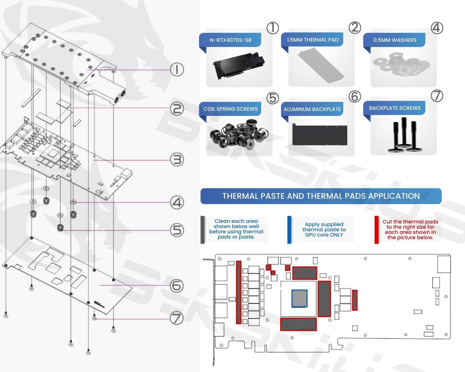 Generally, thermal pads should be installed on the card where the block has corresponding raised contact points, except the GPU core, which uses thermal paste. Installing pads on other components can lead to improper contact and poor performance.