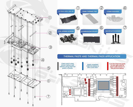 Generally, thermal pads should be installed on the card where the block has corresponding raised contact points, except the GPU core, which uses thermal paste. Installing pads on other components can lead to improper contact and poor performance.