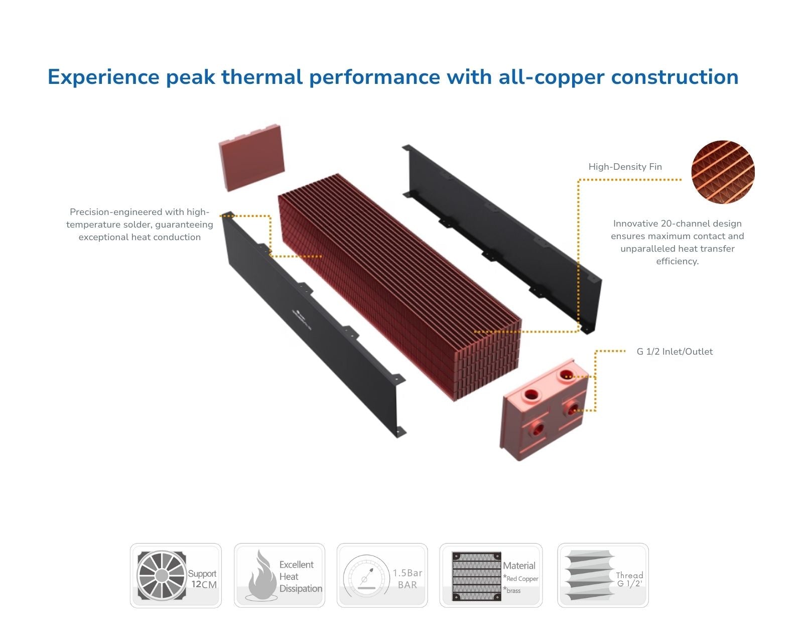 Copper Liquid cooling loops using G1/2” threaded fittings and standard PC coolant. Supports use with most D5/DDC pumps and PC water cooling components. Check physical space and mounting requirements before purchase.