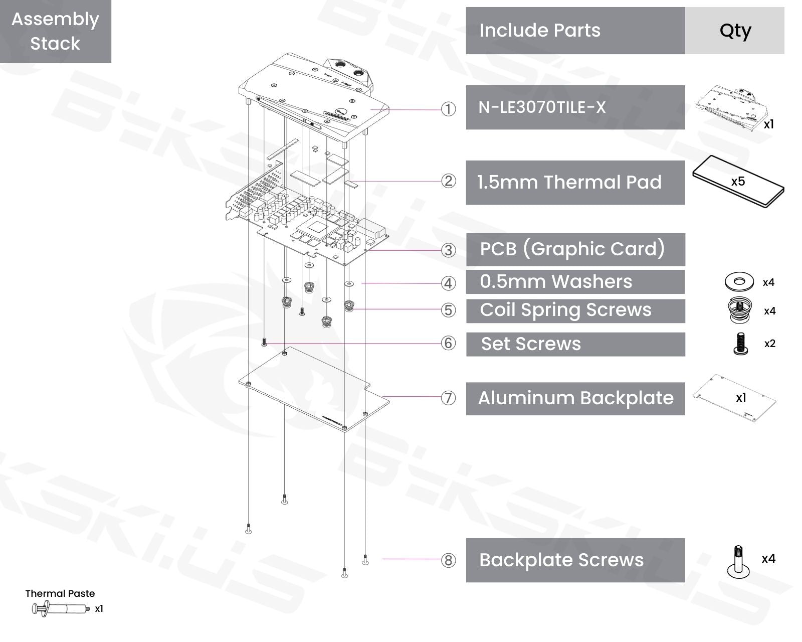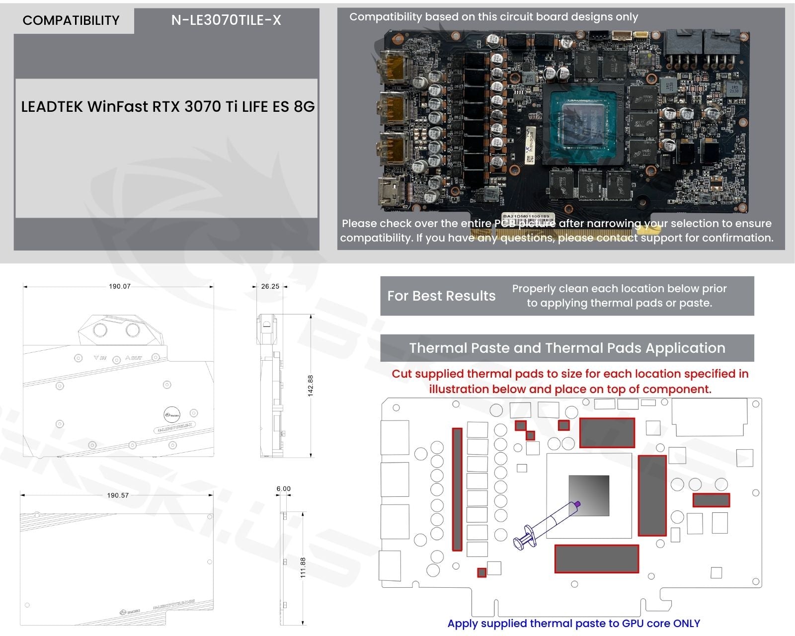 The manufacturer reserves the right to alter the block design to expand compatibility. The delivered item may not 100% match the pictured item. The product does NOT come with English instructions. Please see the product gallery images for the install guide if available. Generally, thermal pads should be installed on the card where the block has corresponding raised contact points, except the GPU core, which uses thermal paste. Installing pads on other components can lead to improper contact and poor performance.