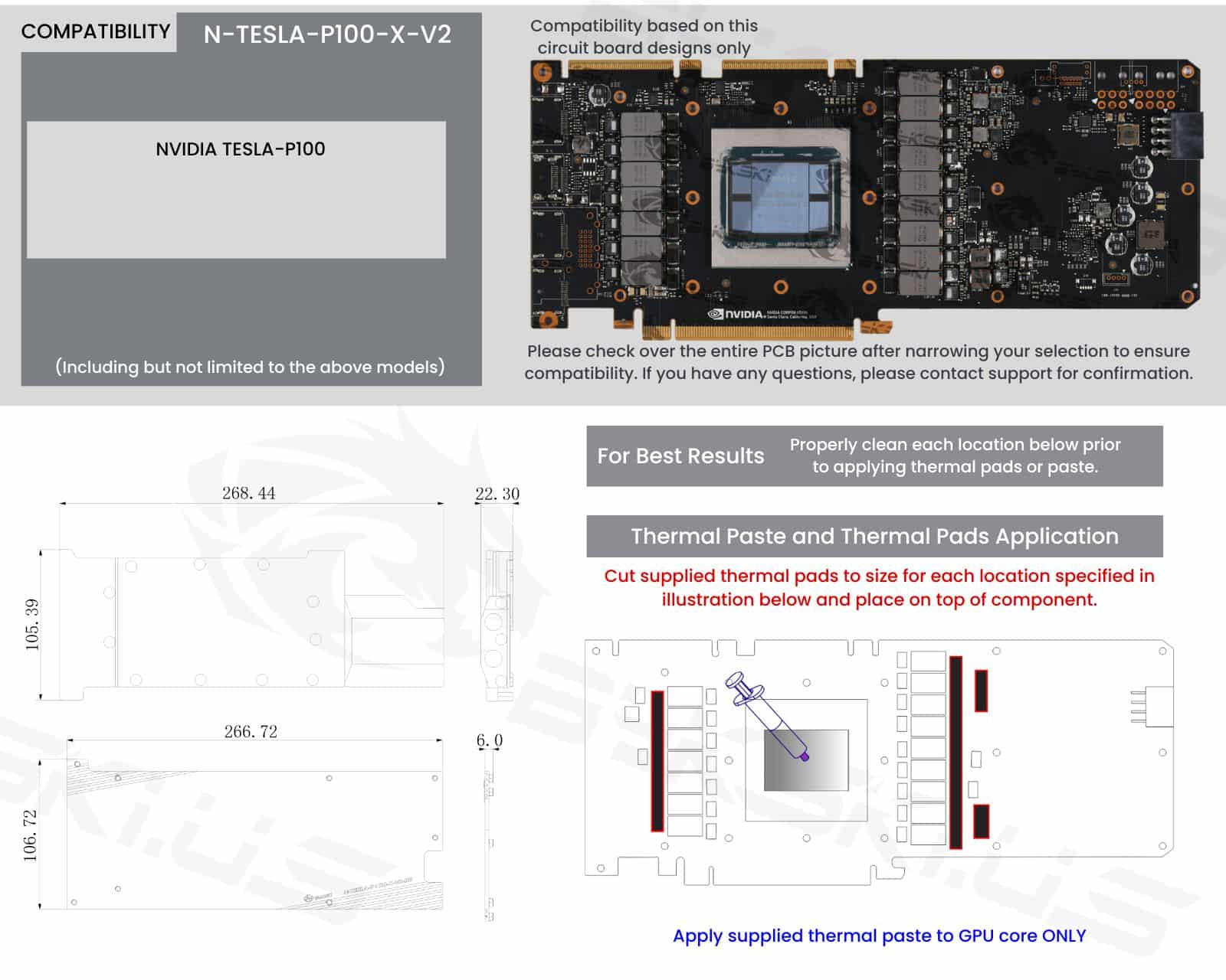 The manufacturer reserves the right to alter the block design to expand compatibility. The delivered item may not 100% match the pictured item. The product does NOT come with English instructions. Please see the product gallery images for the install guide if available. Generally, thermal pads should be installed on the card where the block has corresponding raised contact points, except the GPU core, which uses thermal paste. Installing pads on other components can lead to improper contact and poor performance.