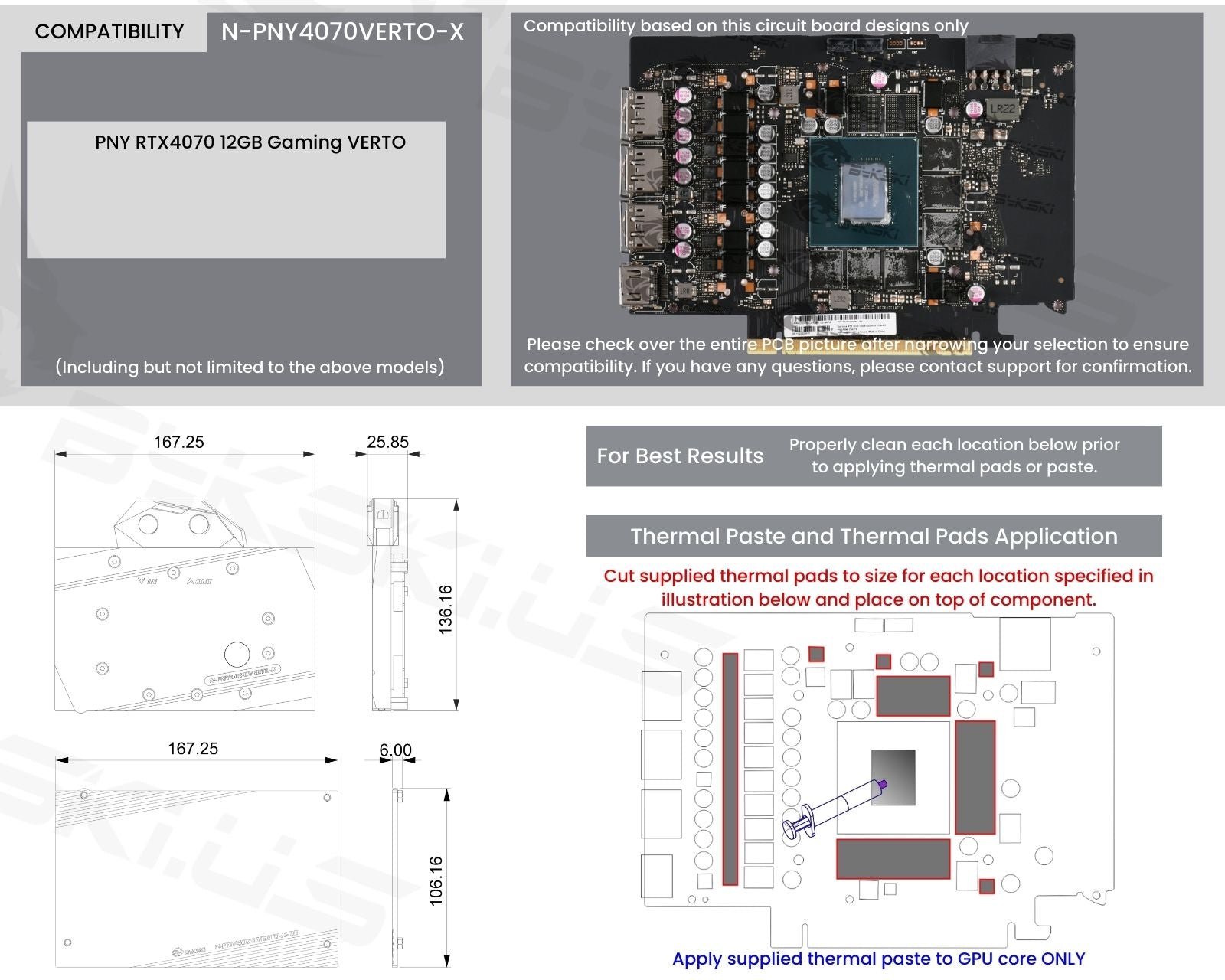 The manufacturer reserves the right to alter the block design to expand compatibility. The delivered item may not 100% match the pictured item. The product does NOT come with English instructions. Please see the product gallery images for the install guide if available. Generally, thermal pads should be installed on the card where the block has corresponding raised contact points, except the GPU core, which uses thermal paste. Installing pads on other components can lead to improper contact and poor performance.