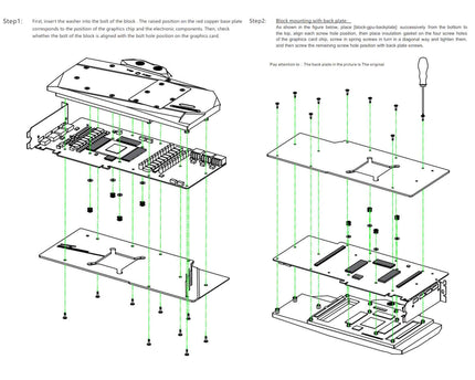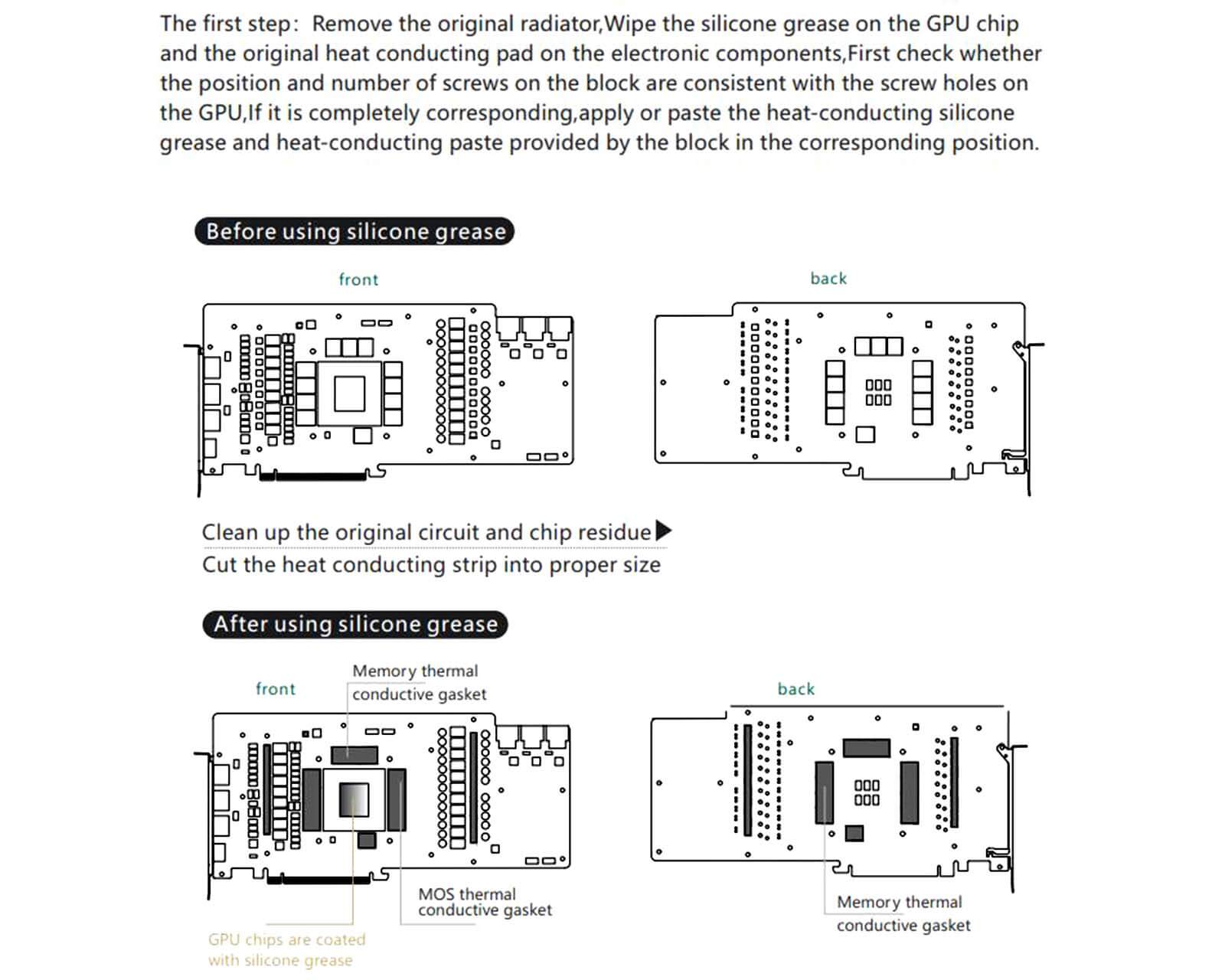 Manufacturer reserves right to alter block design to expand compatibility. Delivered item may not 100% match pictured item. Product does NOT come with English instructions. Please see product gallery images for install guide if available. Generally, thermal pads should be installed on the card where the block has corresponding raised contact points with the exception of the GPU core, which uses thermal paste. Installing pads on other components can lead to improper contact and poor performance.