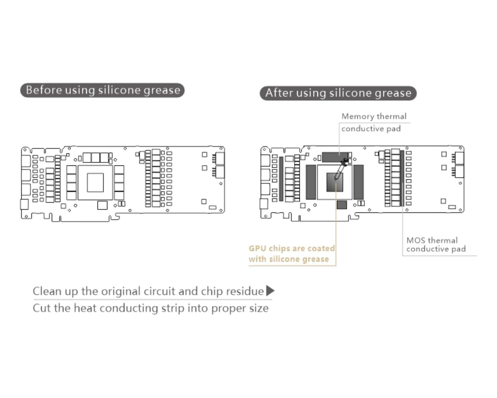 The manufacturer reserves the right to alter the block design to expand compatibility. Delivered items may not 100% match the pictured item. The product does NOT come with English instructions. Please see the product gallery images for the install guide if available. Generally, thermal pads should be installed on the card where the block has corresponding raised contact points except the GPU core, which uses thermal paste. For -TC SKU blocks with active backplates, the VRAM on the back of the card should be padded. Installing pads on other components can lead to improper contact and poor performance.