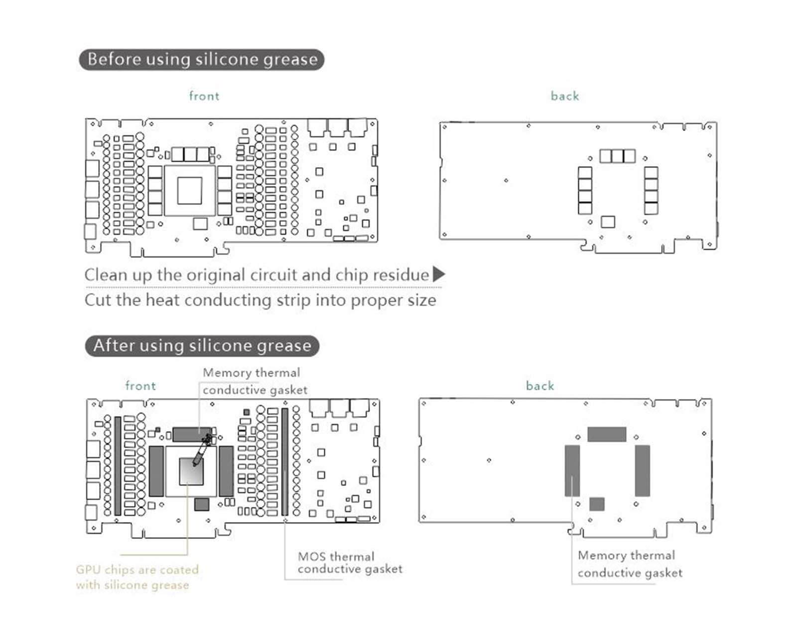 Manufacturer reserves right to alter block design to expand compatibility. Delivered item may not 100% match pictured item. Product does NOT come with English instructions. Please see product gallery images for install guide if available. Generally, thermal pads should be installed on the card where the block has corresponding raised contact points with the exception of the GPU core, which uses thermal paste. For -TC SKU blocks with active backplates, the VRAM on the back of the card should be padded. Installing pads on other components can lead to improper contact and poor performance.