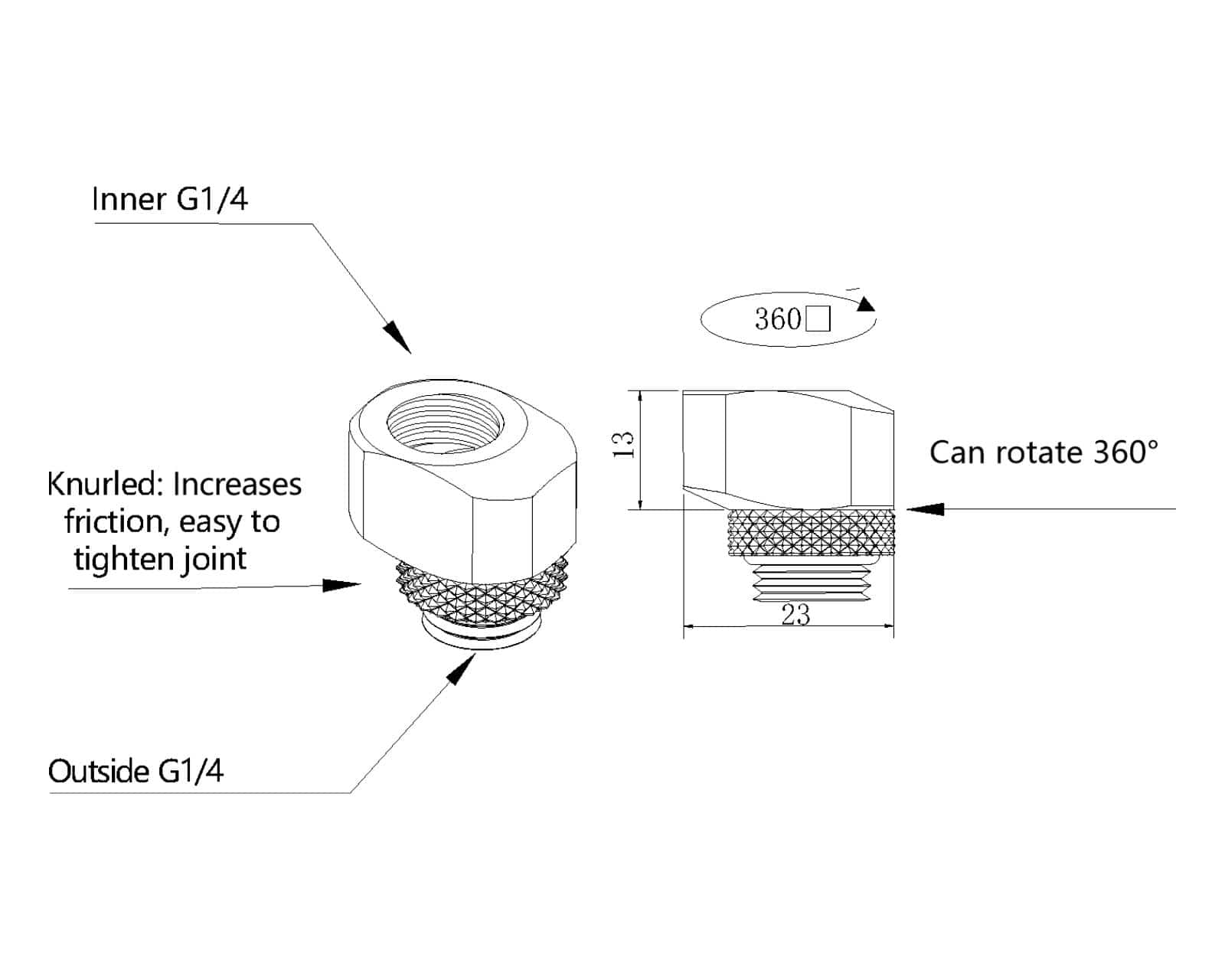 The Bykski CC-HR-X G1/4in. Rotary Offset Degree Fittings are made of CNC machined brass with a high quality surface treatment process. They feature G1/4 thread, can rotate 360 degrees around its axis, and can be fine-tuned and find the exact positioning needed. Seals are made of high quality rubber.