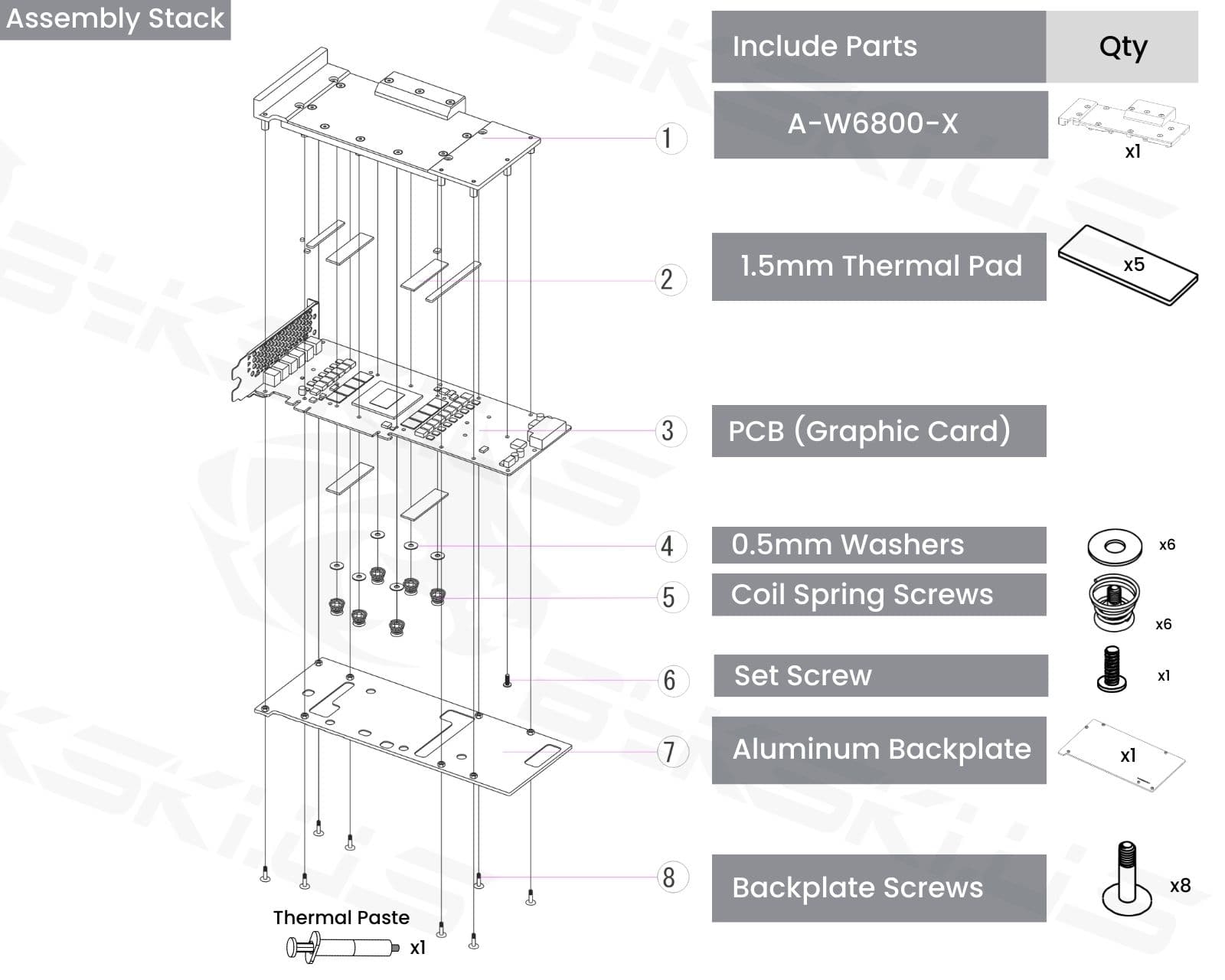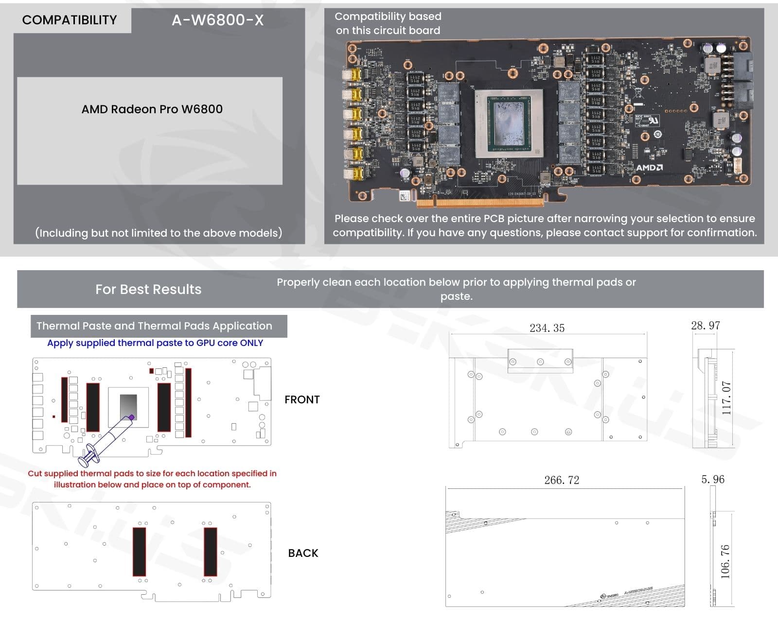 The manufacturer reserves the right to alter the block design to expand compatibility. The delivered item may not 100% match the pictured item. The product does NOT come with English instructions. Please see the product gallery images for the install guide if available. Generally, thermal pads should be installed on the card where the block has corresponding raised contact points, except the GPU core, which uses thermal paste. Installing pads on other components can lead to improper contact and poor performance.