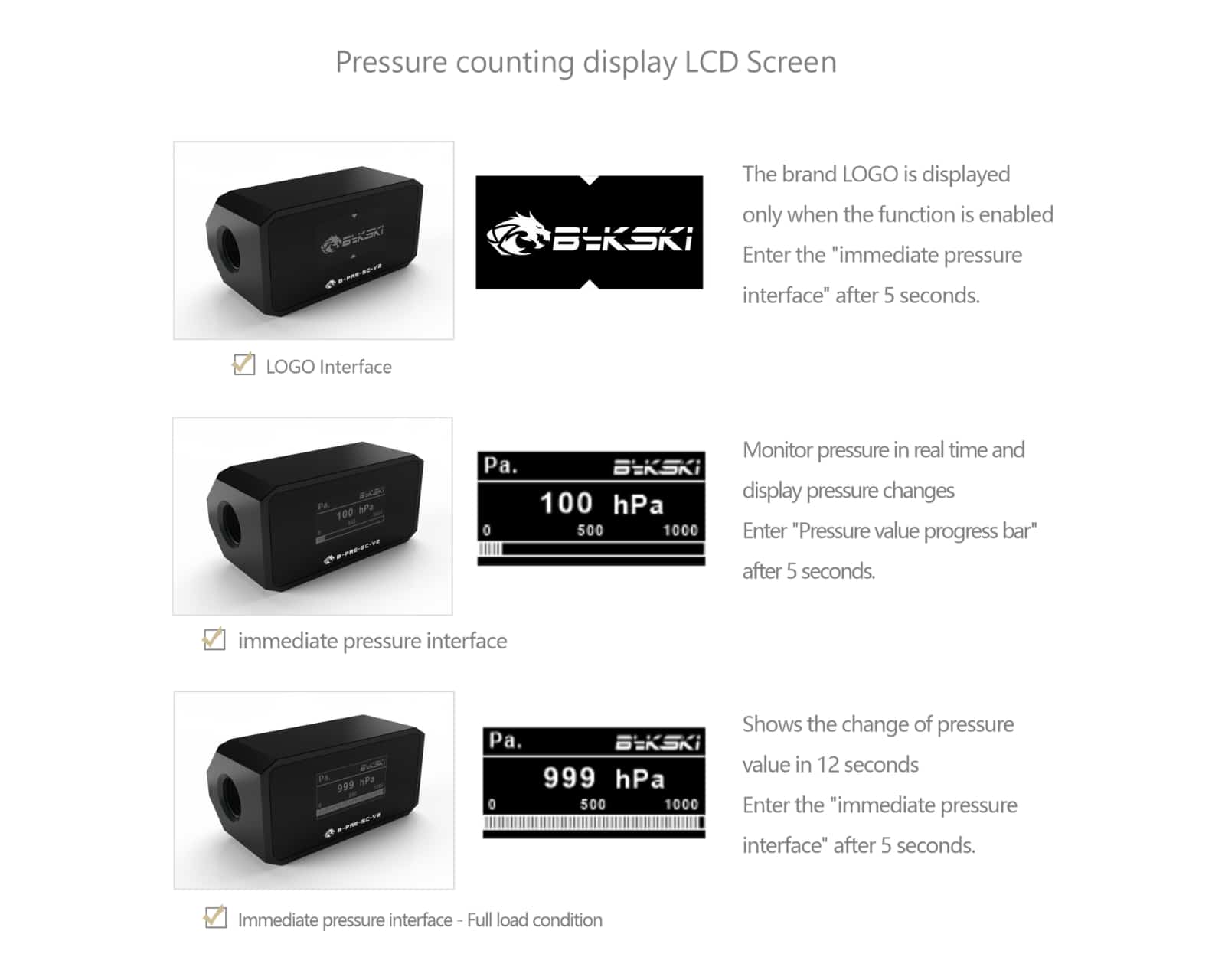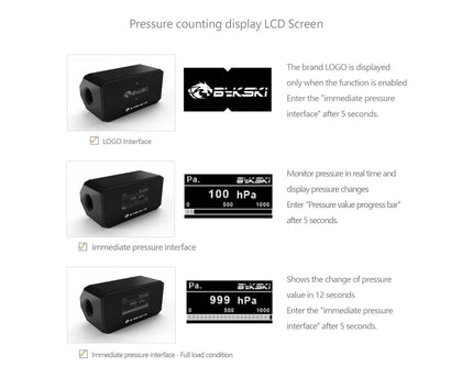 The main function of the Bykski pressure gauge is to clearly monitor the internal pressure of the water cooling system, effectively understand the operation of the water cooling system, and immediately control the safety limit. This module monitors the pressure in real-time and displays pressure changes as well.