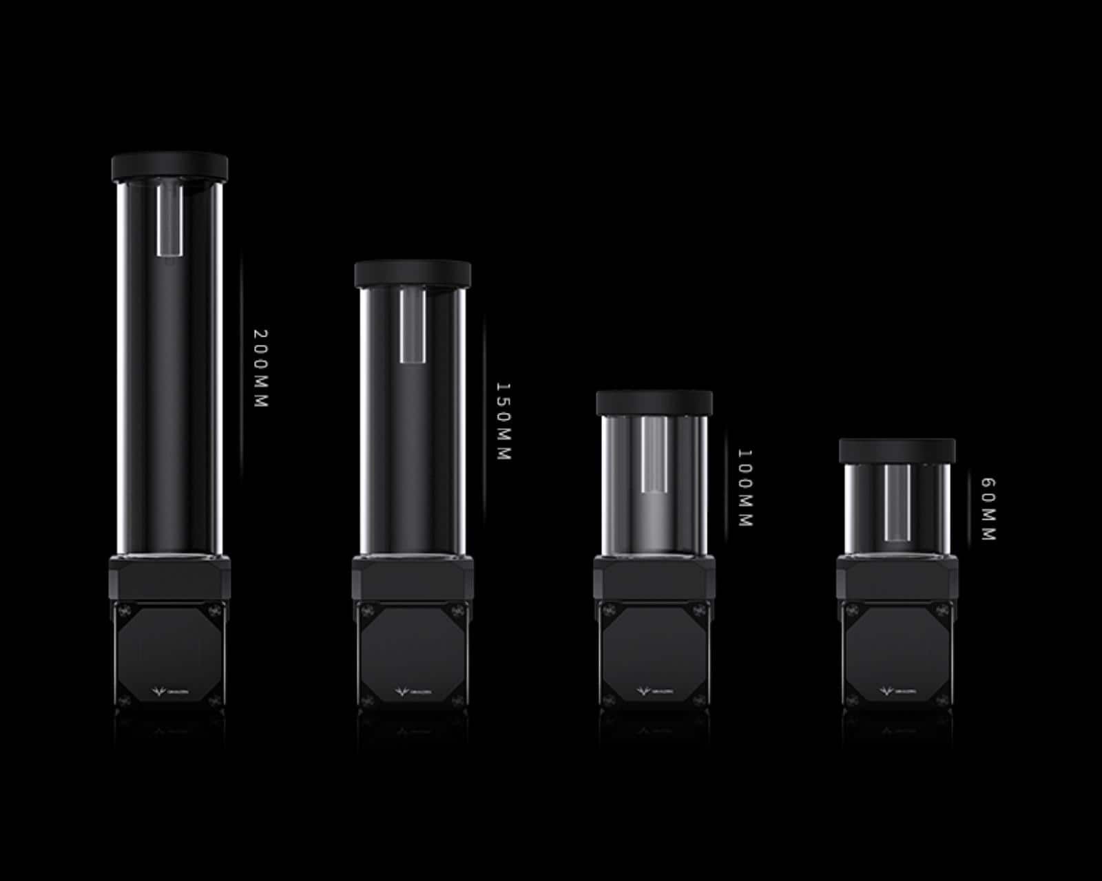 This Granzon Reservoir/PWM DDC Pump Combo has multiple digital display read outs. Highlighting the display readouts is a tachometer design, real time display of pump speed. Speed control can be set manually in increments of 100. Automatic mode is also available when using your motherboards PWM header. Flow rates, voltage and load are displayed as well for a complete overview of your pumps performance. Keep in mind the flow rate is based on the pump speed. This means the lower your loop resistance the more accurate the reading will be. For most applications it will be a very accurate simulation. The pump is ready to use with a POM body encasing the pump. The top is threaded for instant reservoir tube adaptation and are available in multiple lengths.