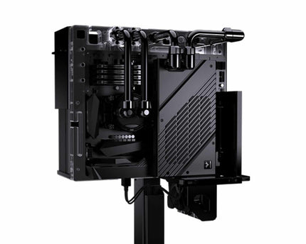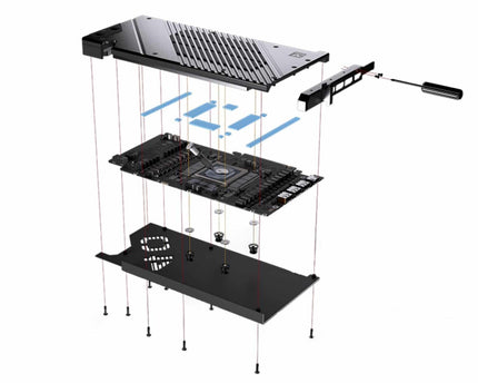 The block is constructed of high-purity copper that is nickel electroplated to prevent oxidation. The base and top are wrapped in full aluminum armor creating a stunning visual look. Top and bottom ports can be used to configure parallel or serial designs in multi-block setups.