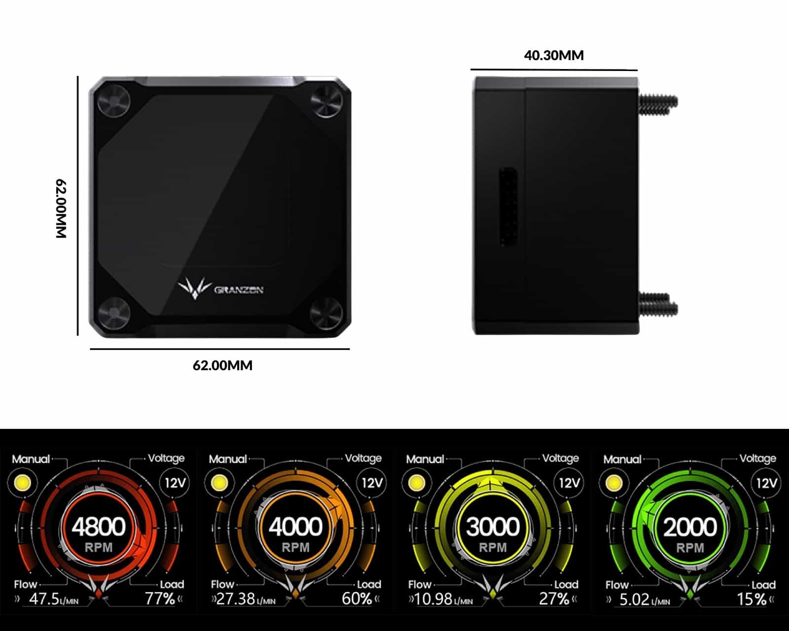 The Granzon PWM DDC Add-on Pump with Digital Display is a DDC-style pump with multiple digital display readouts. Highlighting the display readouts is a tachometer design, a real-time display of pump speed. Speed control can be set manually in increments of 100. Automatic mode is also available when using your motherboard's PWM header. Flow rates, voltage, and load are displayed for a complete overview of your pump's performance.
