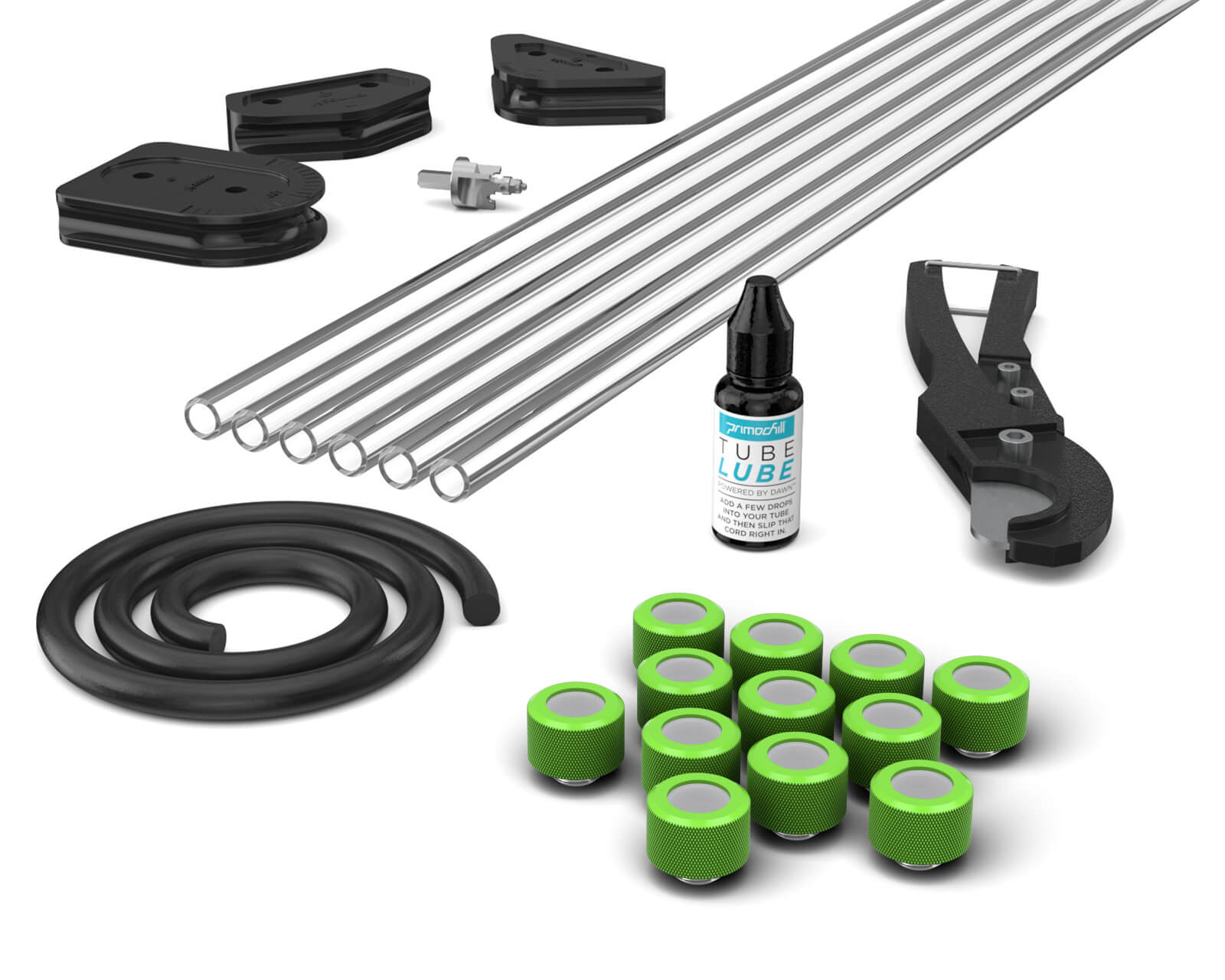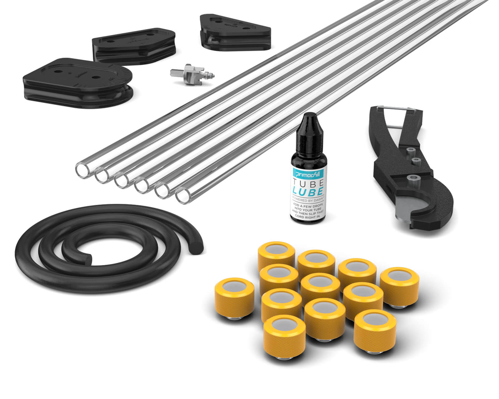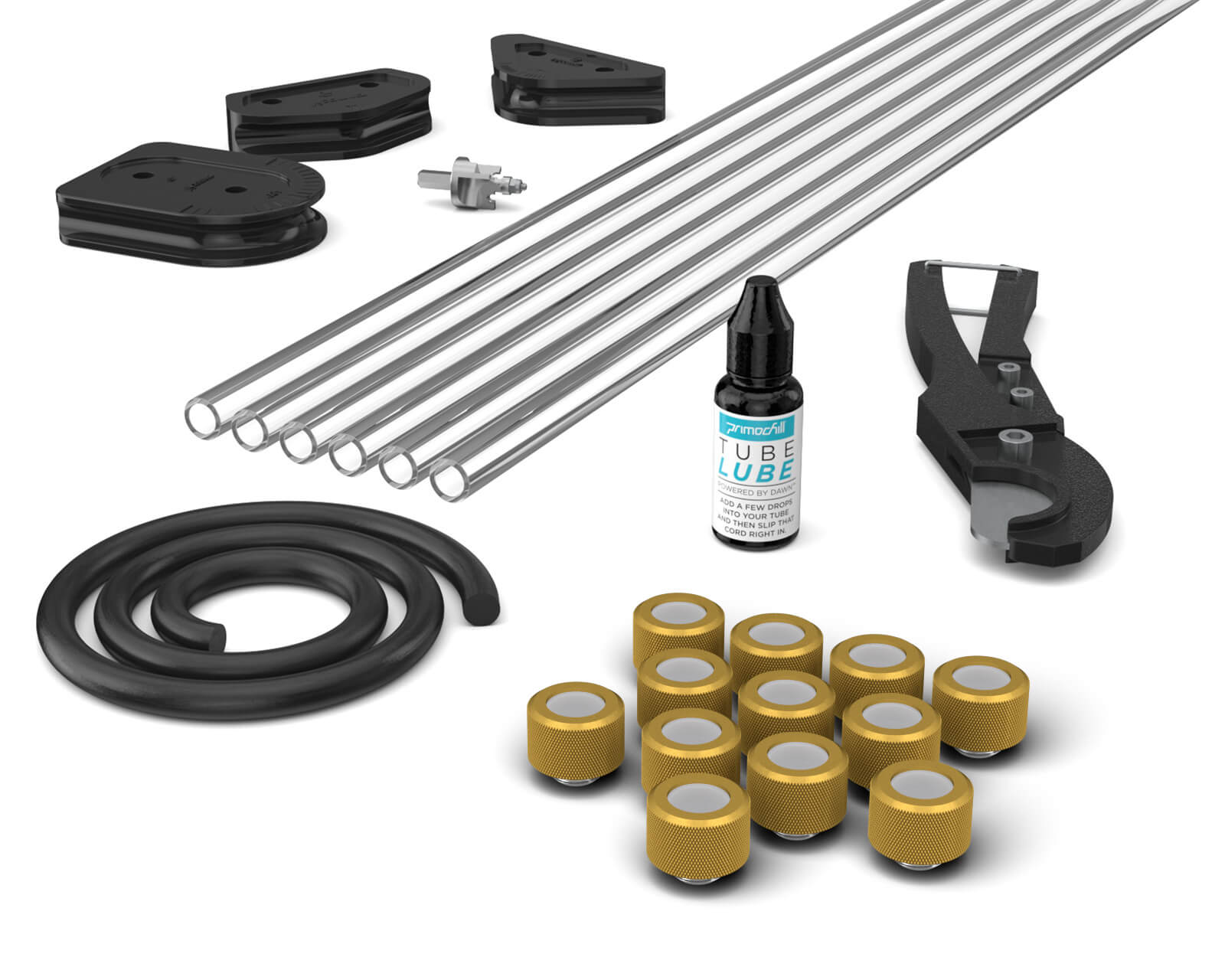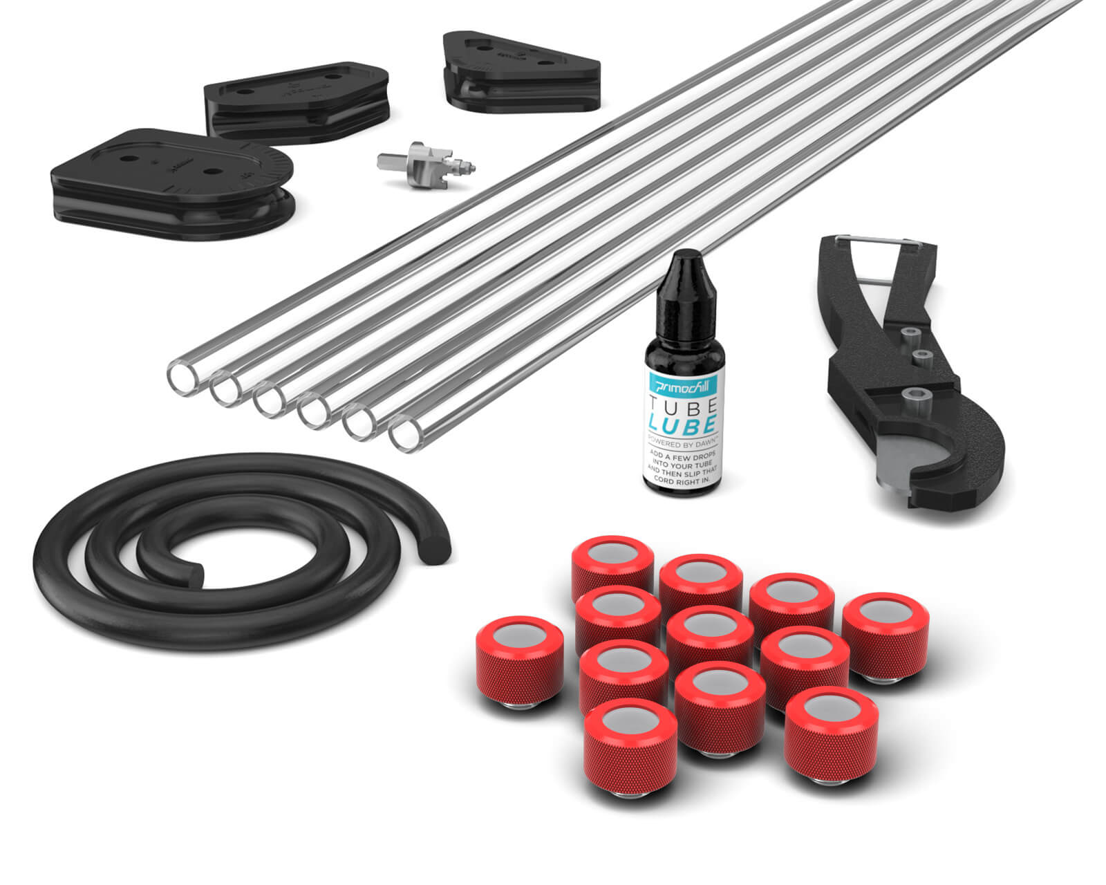PrimoChill is making PETG as accessible as ever. Now we offer kits with metric sizes! Using this complete pack you have the PETG required for any system and twelve fittings to outfit most systems. Along with these you get a universal tube cutter for clean cuts and a bending insert with tube lube to prep your tube for bending. Also included in the Complete pack is a bending angle guide set to get perfect bends and a rigid finishing bit to smooth tubing ends and fine tune lengths. The fittings are available in the entire SX color line. Grab what you need at a discount and get building!