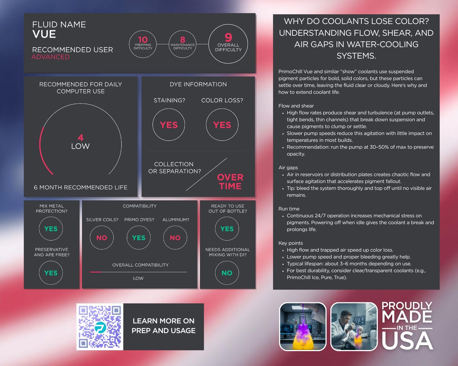 Vue has a HIGH attraction to dyes. It's possible that it may leach old dyes out of components that had previous dyed coolants ran through them (radiators in particular). No amount of flushing with water will remove all previous dyes. This may result in Vue changing color slightly. For best results flush your system with PrimoChill System ReBoot prior to using VUE in existing systems that contained dyed coolant.